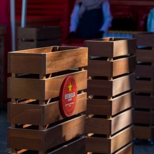 Tanto la carpa de avituallamiento como la carpa de inscripción están elaboradas a juego con el mobiliario íntegramente realizado en madera de pino. Las traseras, también en pino, lucen un gran logotipo de Estrella Damm en color rojo.